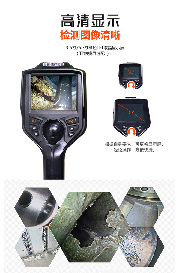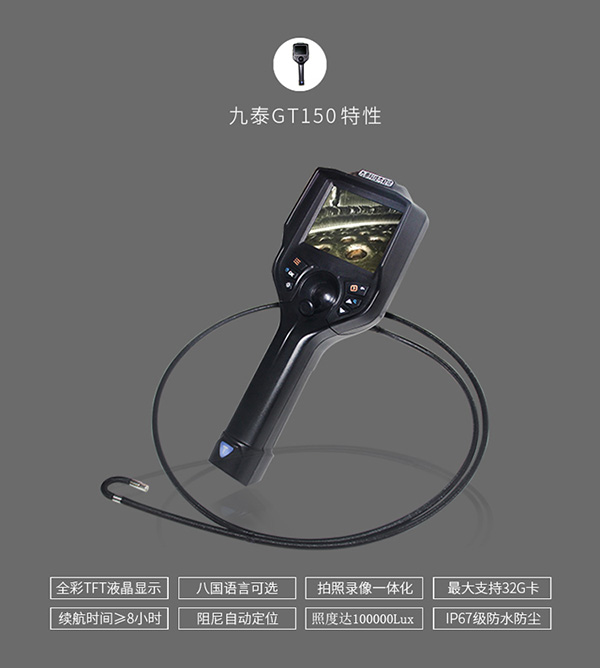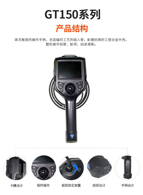 GT150系列手持汽車內(nèi)窺鏡是一款可無限擴(kuò)展、兼容性超強(qiáng)的智能高清視頻內(nèi)窺鏡。采用全彩TFT液晶顯示屏,高清圖像傳感器,遠(yuǎn)距離圖傳技術(shù),高靈敏度的操作手柄,多層編織工藝的插入管,耐磨防摔的工程合金外殼,整機(jī)操作輕便、耐用,拍錄清晰。HD高清實(shí)時(shí)拍錄,獨(dú)特的雙組電池續(xù)航設(shè)計(jì),續(xù)航提升一倍,同時(shí)支持電池自主更換??蛇x2mm-8mm不同直徑探頭,可靠穩(wěn)定、成像效果好!主要用于檢查4~200mm直徑的工業(yè)管路或復(fù)雜狹小的設(shè)備內(nèi)部空間,對腐蝕、裂紋、焊縫、異物、磨損以及零部件內(nèi)部的加工等情況井行細(xì)致全面的檢測。