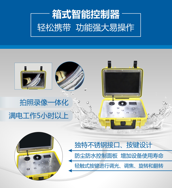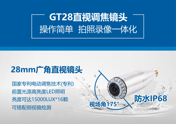 GT28系列管道內窺鏡是一款多功能型內窺鏡,10.1寸高清顯示智能控制器,10-50m材質為GFRP檢測線可供長距離檢測。直徑28mm電動調焦鏡頭在管道內部全方位觀察。