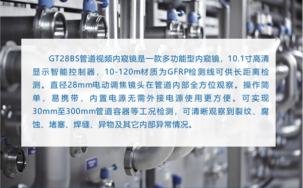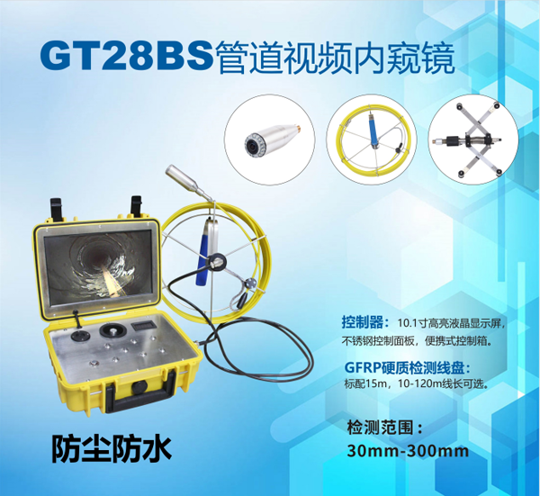 GT28BS工業管道內窺鏡操作簡單,攜帶便攜,內置電源無需外接電源等眾多優勢。可實現30mm至400mm的管道容器等工況檢測,可清晰觀察到裂紋,腐蝕,堵塞,焊縫,異物及內部異常情況。
